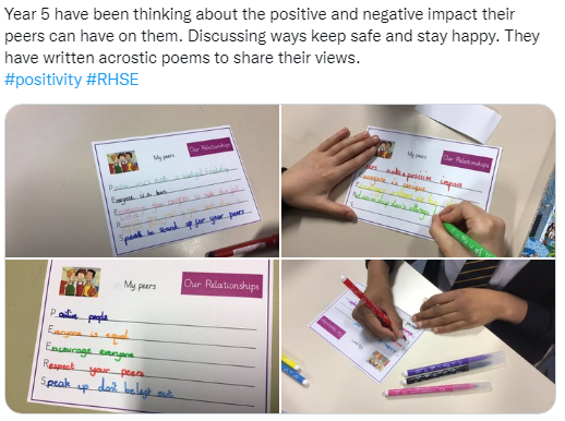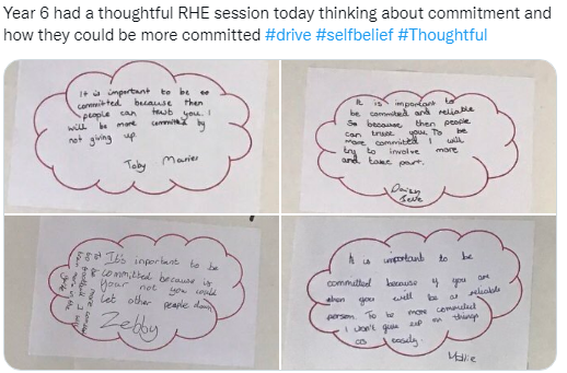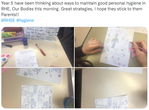 Learning is captured weekly in the class RHE portfolio and on the 'washing line' in the classroom. Throughout the week, references are made to the outcomes and learning on the washing line to support and deepen understanding across the curriculum and the children's personal development.
